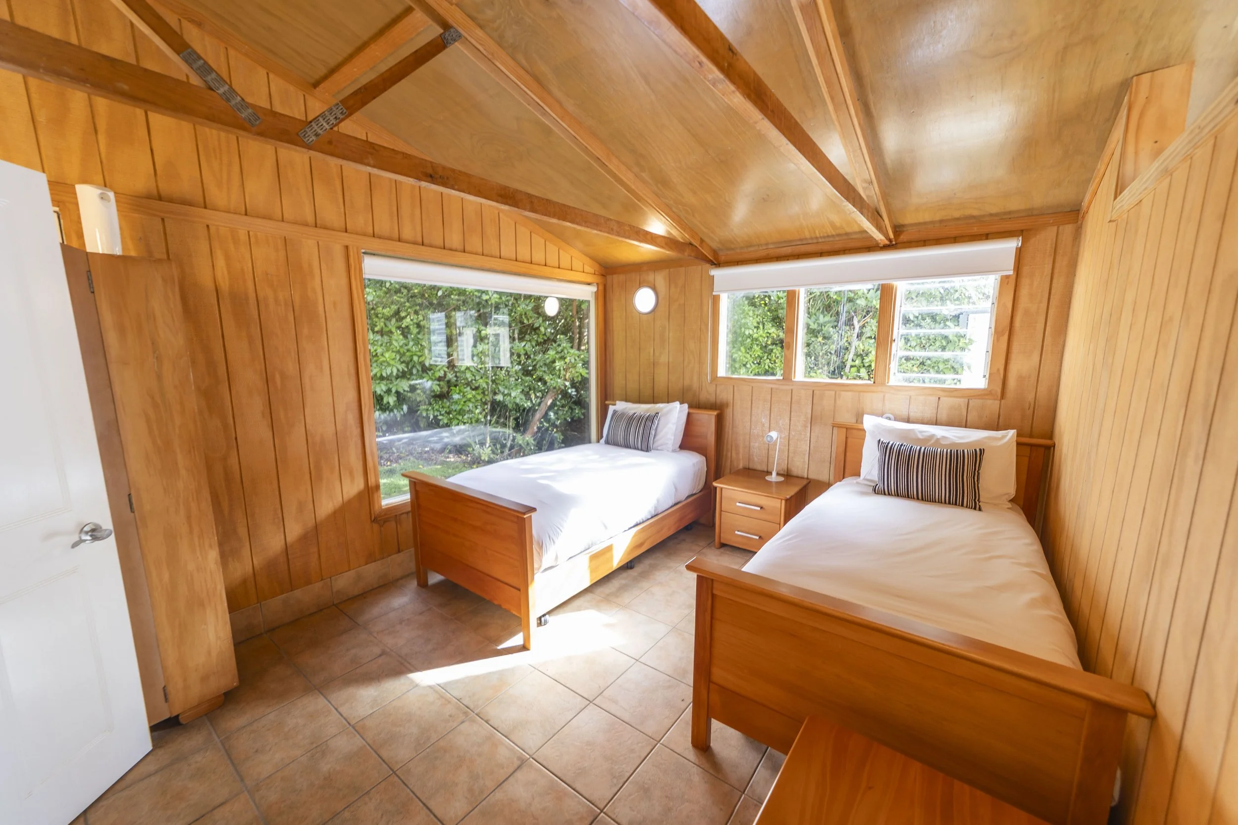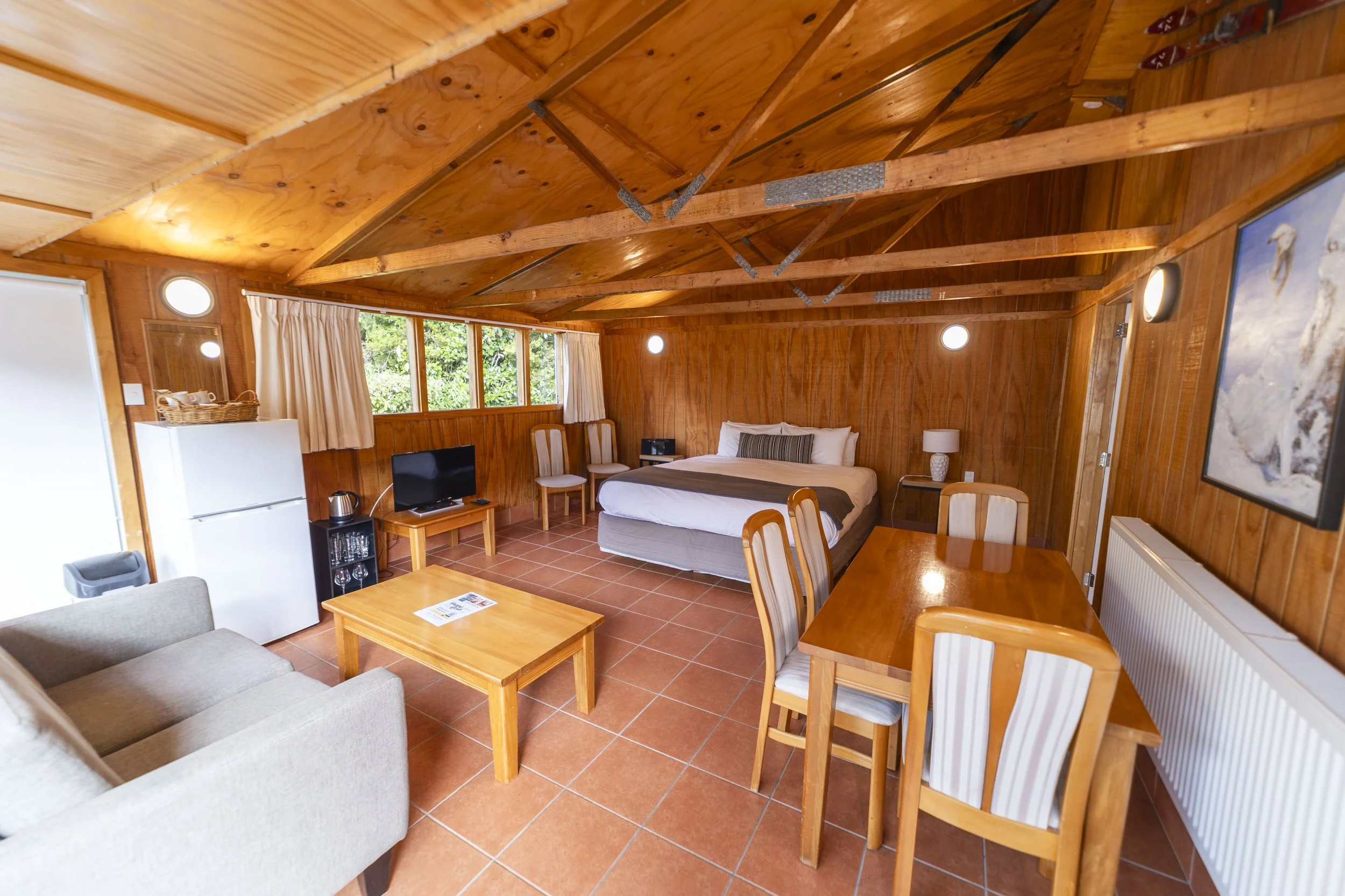 This stand-alone private cabin features two separate rooms. The main lounge area includes a super king bed, the second room has twin beds and leads directly into the bathroom, making it a perfect base for a relaxing mountain getaway.